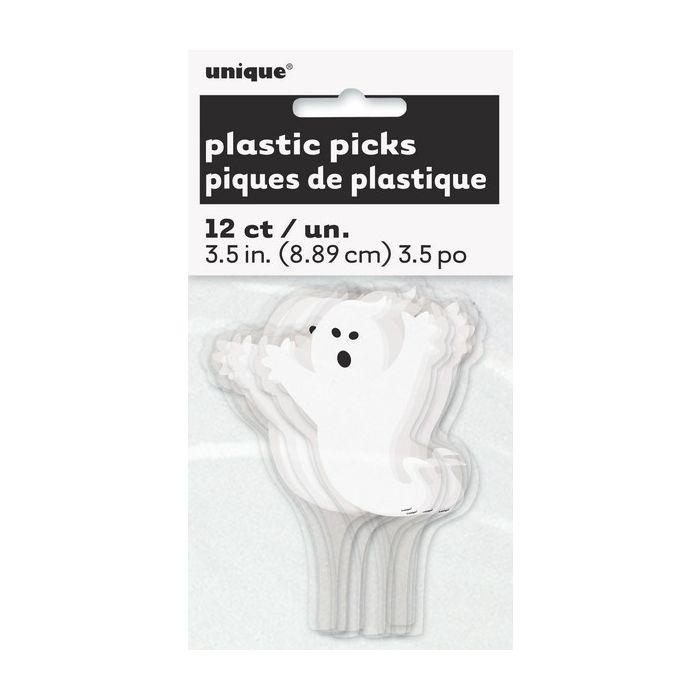 Il s'agit d'un lot de 12 piques fantôme, en plastique, mesurant 8,89 cm de haut. Ces piques fantôme sont transparents, surmontés d'un fantôme blanc, prêt à faire peur !