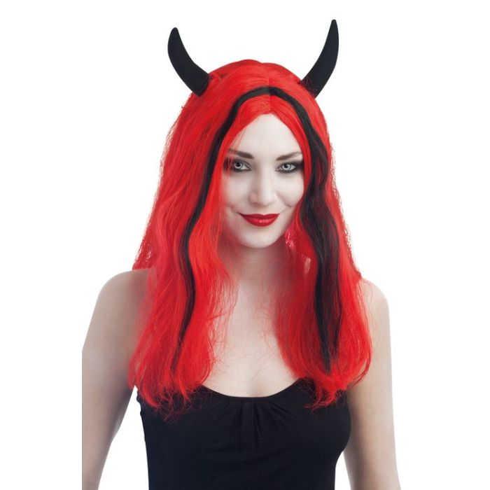 Pour l'occasion, nous vous proposons une perruque qui vous rendra méconnaissable : une perruque de diablesse. Elle se présente sous la forme de cheveux rouges et longs avec deux mèches noires sur le devant et une paire de cornes noires.