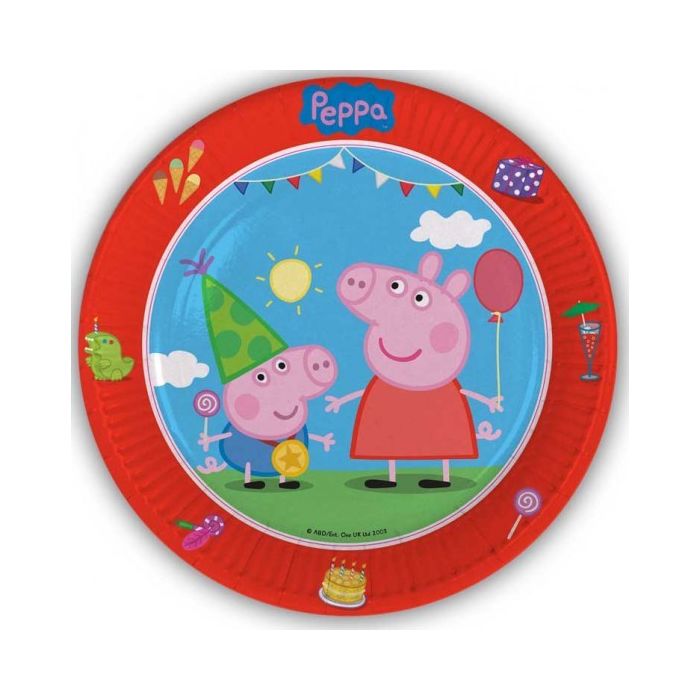 Voici 8 assiettes Peppa Pig en carton mesurant 23cm de diamètre. Ces assiettes Peppa Pig sont multicolores et vont apporter beaucoup de gaieté et de couleur à votre table d’anniversaire. Dans cette assiette Peppa Pig, vous pourrez servir de grosses parts de gâteau, parce qu’un goûter d’anniversaire, ça n’arrive pas tous les jours.