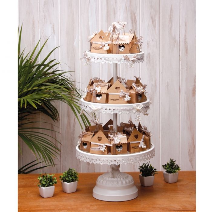 Présentoir à dragées trois étages en métal blanc - D23/27/30 cm et H 66 cm