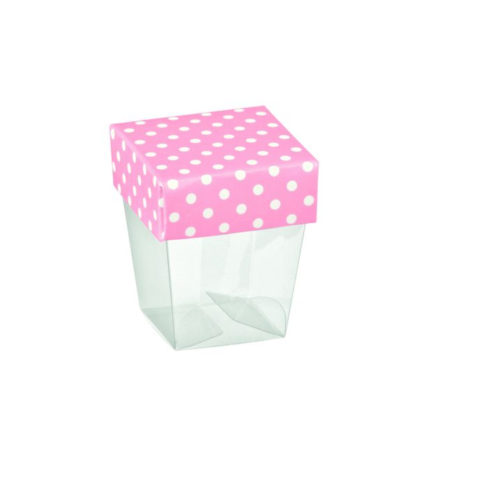 10 Boîtes à dragées transparentes et roses à pois blancs 3,3 cm x 3,3 cm x 5 cm
