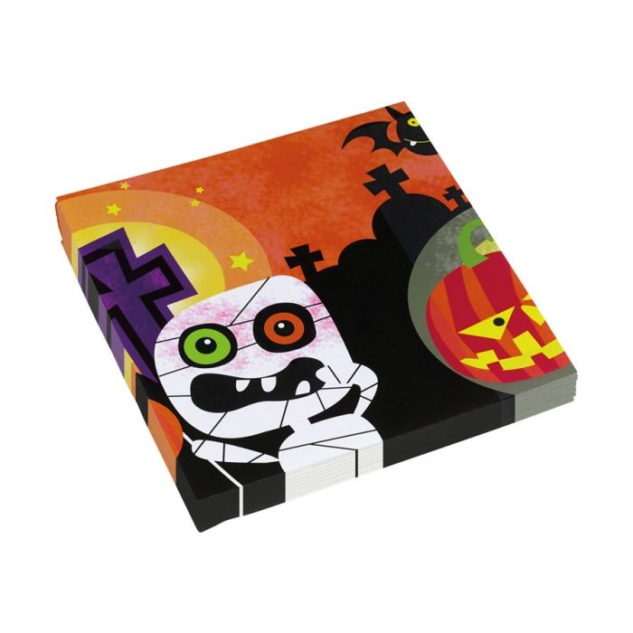 C'est pourquoi, nous vous proposons un accessoire indispensable à toutes fêtes. Il s'agit d'un lot de 20 serviettes en papier spécialement conçues pour Halloween. Ce sont des serviettes momie de dimensions 33 x 33 cm. Elles sont illustrées de personnages phares d'Halloween dans un lieu frissonnant d'horreur, le cimetière. On y retrouve une momie, une chauve-souris, une citrouille, dans les tons noir et orange.