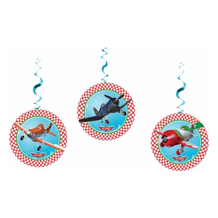 Lot de 3 belles suspensions en papier Planes de 70 cm de hauteur, avec des disques multicolores à l’effigie des héros de la série et des rubans en papier rigide de couleur bleu pour les suspendre. Une décoration au succès assuré !