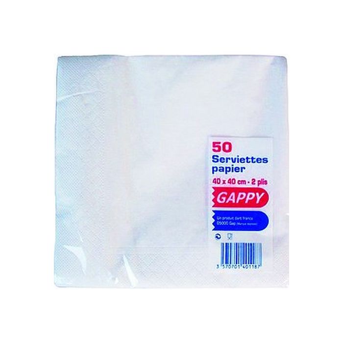 Lot de 50 serviettes en papier, de couleur blanche et avec deux plis ! Dimensions 38 centimètres par 38 centimètres !