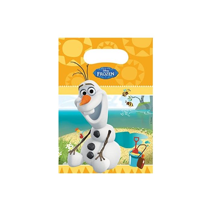 6 pochettes Olaf Summer - La Reine des neiges, en plastique. De superbes sacs anniversaire La Reine des Neiges avec le joyeux bonhomme de neige Olaf !
