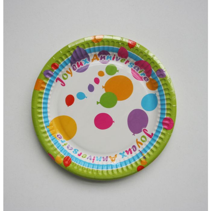 Il s'agit de 8 assiettes Joyeux Anniversaire, d'un diamètre de 18 cm. Le résultat est magnifique et très tendance ! "Joyeux Anniversaire" y est inscrit en multicolore sur un fond très coloré, pour un résultat festif à souhait !