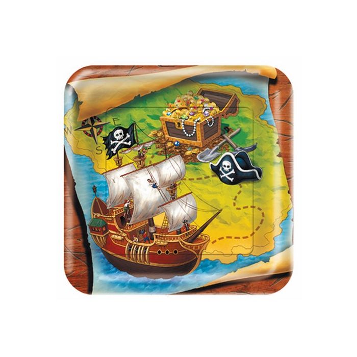 8 assiettes trésor pirate, de 18 cm de côté, en carton, multicolore. Un design hors du commun qui fera de votre anniversaire pirate une fête spectaculaire.