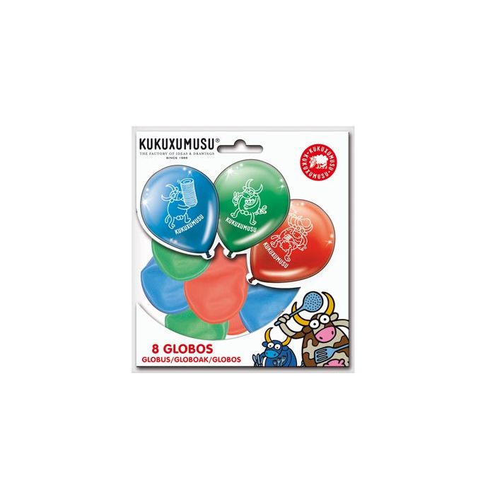 8 ballons Kukuxumusu aux couleurs rouge, bleu et verte avec un dessins de son célèbre taureau Kukuxumusu dans des situations toujours improbables.