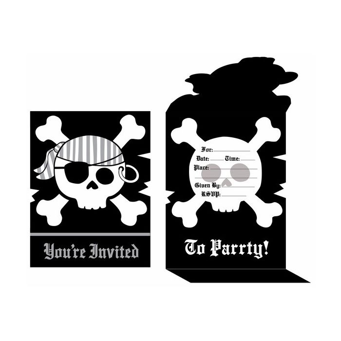 8 invitations Pirate Party, en papier, de 10 x 12 cm, de couleur noire et blanche, avec une illustration de tête de mort pirate. Les enfants en sont fans !