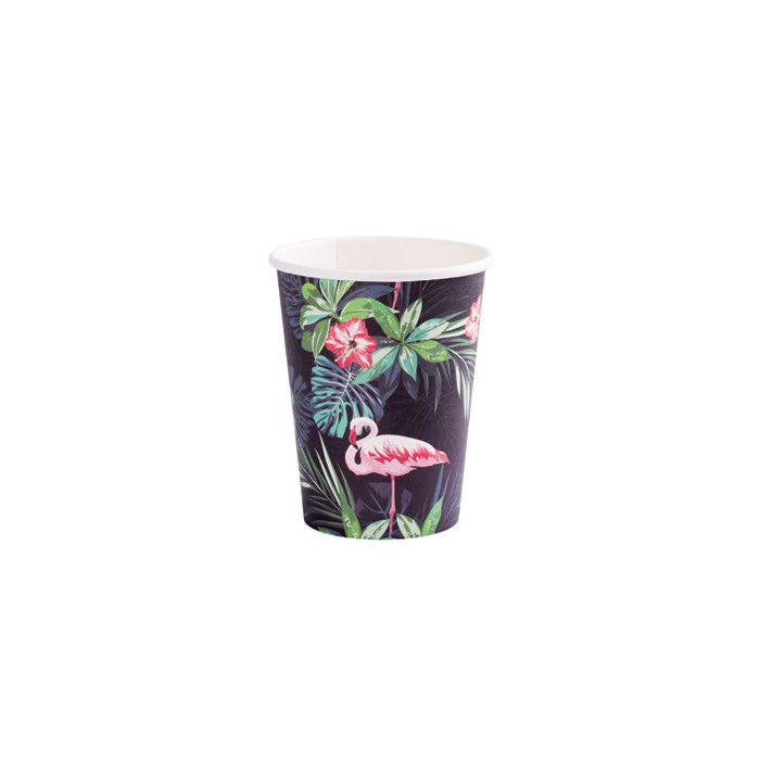 Lot de 8 gobelets jetables appartenant à la collection flamant rose de mes-fetes.com, le spécialiste de la décoration pour tous vos événements. Couleur de fond : Vert foncé. Motifs : Flamants roses, fleurs roses, plantes tropicales vert tendre et clair. Vaisselle jetable. (Assiettes et serviettes en papier avec les motifs identiques disponibles.)