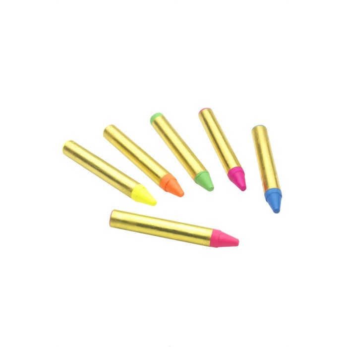 Kit maquillage de déguisement composé de 6 crayons fluo : vert, jaune, bleu, rose, orange et fuchsia.