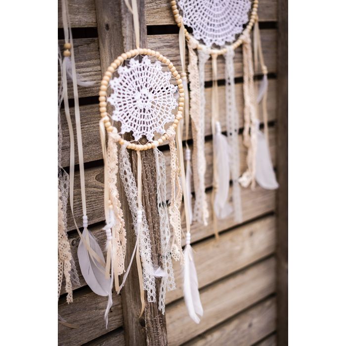 Eloignez les mauvais esprits le jour de votre cérémonie (mariage, baptême, communion) à l'aide de ce magnifique attrape-rêves en dentelle, avec des perles en bois et plumes blanches.