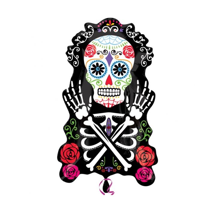 Ballon Halloween de la collection dia de las muertos d'une dimension de 28 cm x 71 cm, ballon aluminium en forme de tête de mort..