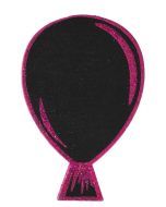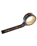 Il s'agit d'un ballon rond de couleur noire qui comporte des motifs de guirlandes de fanions colorées et au centre un rond blanc avec écrit Joyeux anniversaire de toutes les couleurs.