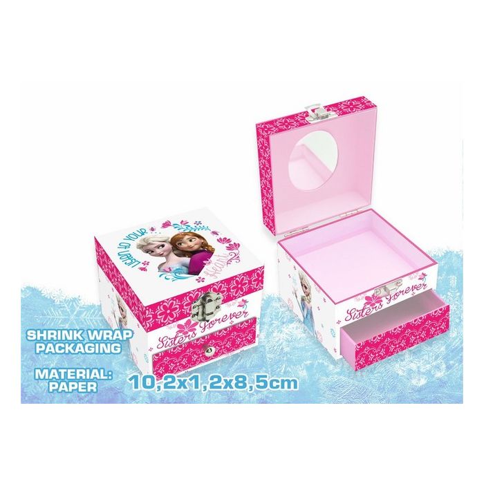 Boîte à bijoux musicale ornée d’un miroir et d’un petit tiroir, en forme de rectangle ! Avec Anna et Elsa de la Reine des Neiges !