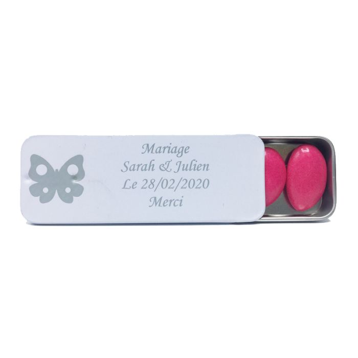 A tout mariage champêtre sa décoration florale et naturelle : cette boite à dragées personnalisable est l’occasion pour vous de créer une atmosphère unique, à votre image. La boite à dragées gris clair ornée d’un papillon sur son côté droit est l’accessoire parfait que vous offrirez à vos convives afin que cette journée que vous avez décidé de partager avec eux soit mémorable. Grâce à notre service de personnalisation vous pourrez y inscrire un ou plusieurs prénoms, une date, un lieu mais également un petit mot de remerciement pour vos invités. Cette boite peut également s’adapter à d’autres types d’événements : un baptême, une communion… Toutes les fêtes sont un prétexte pour offrir un aussi joli cadeau à vos proches. Cette boite de dragées pourra contenir 5 dragées aux chocolats ou aux amandes Avola Pécou et une dizaine de dragées coeur. Il semblerait que vous soyez conquis, ajoutez cette adorable boite à votre panier !
