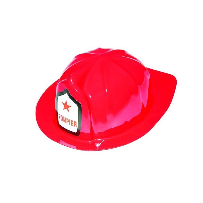 Ce casque de pompier reprend la forme des véritables casques de pompiers et il comporte sur le devant une étiquette où est écrit "Pompier" en rouge surmonté d'une étoile.