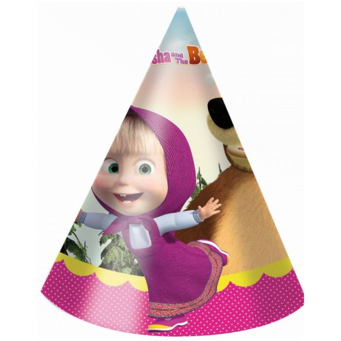 Lot de 6 chapeaux anniversaire Masha et Michka en matière cartonnée, de dimension 15 cm.