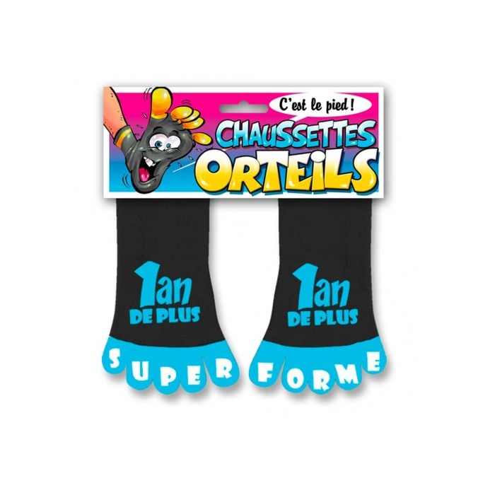 Cette jolie paire de chaussettes à orteils 1 An de + noire et jaune en taille unique fera sensation avec les orteils de couleur jaune et le message Super Forme !