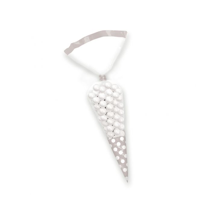 Lot de 10 cônes à friandises en matière plastiquetransparente, avec motifs à pois blanc sur fond gris à la base, de dimensions 24,7 x 10 cm. Ces cônes sont vendus avec attaches souples de couleur assortie.