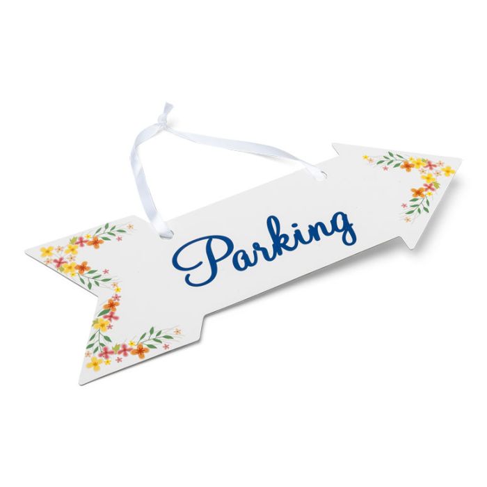 Il s'agit d'une flèche composée d'un panneau blanc avec des motifsà fleurs sur le bord. Le mot "parking" est écrit en bleu marine. Idéal pour événement sur le thème bucolique.