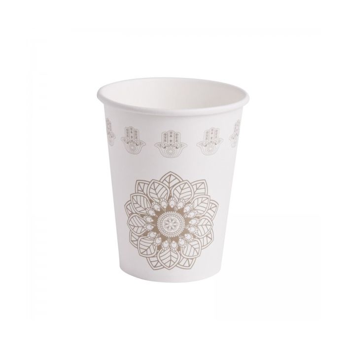 Lot de 10 gobelets en carton sur le thème oriental de coloris or et de dimension 9 x 7.5 cm.