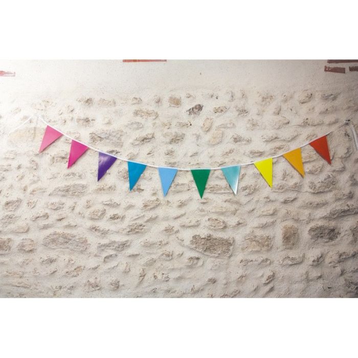 Il s'agit d'une guirlande de fanions multicolores, mesurant 2 mètres de long, composée de fanions de 15 cm de différentes couleurs (rouge, jaune, bleu, vert, rose...).