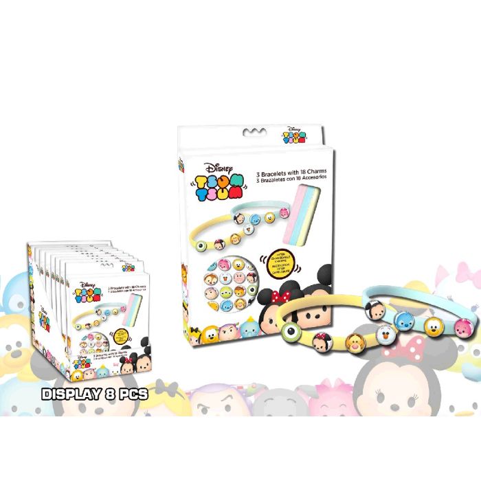 Il s'agit d'un kit composé de 3 bracelets colorés accompagnés d'un lot de 18 charms illustrés des visages des Tsum Tsum, d'adorables et très mignons petits personnages Disney. Dessinés façon Kawai, dans un style japonais, parmi ces personnages on retrouve les plus emblématiques tels que : Mickey et Minnie, Winnie l'Ourson, Donald, Bambi,...