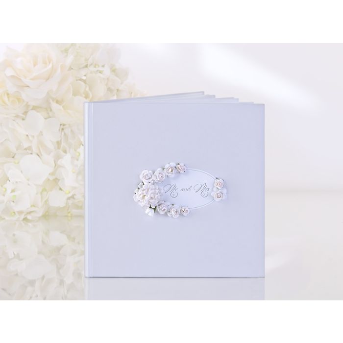 Livre d'or de couleur blanche avec une étiquette en son centre entourée de petites roses blanches. Etiquette avec inscription Mr and Mrs.