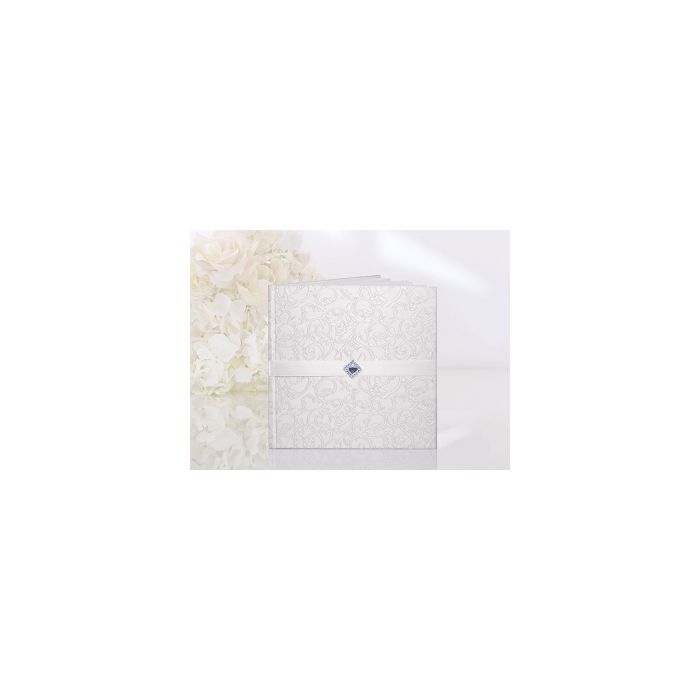 Livre d’or mariage jacquard, forme carré de 20,5 cm de côté, composé de 22 pages blanches. Couverture recouverte d’un sublime jacquard blanc crème, d’un ruban en son milieu et d’un bijou argenté.
