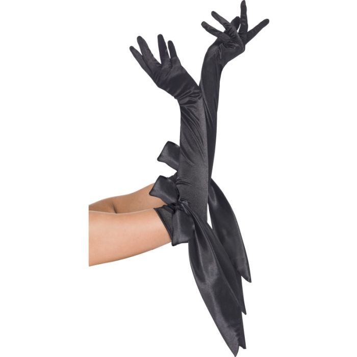 Longs gants noirs effet satin avec noeud, taille unique, mesurant 43 cm de long, polyester. Un accessoire de déguisement incontournable pour une soirée déguisée sur le thème du burlesque !