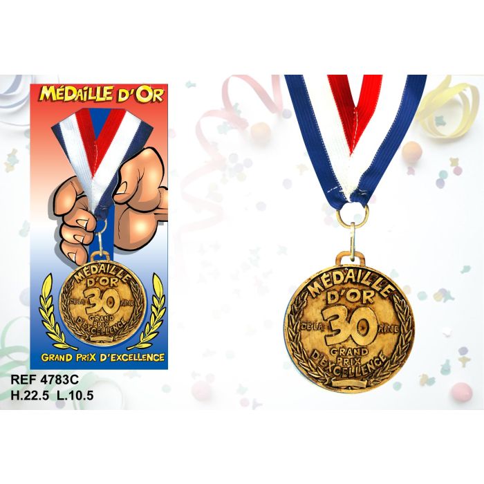 Tablez sur un cadeau humoristique pour l’anniversaire de votre ami avec cette jolie médaille d’or 30 ans avec lien tricolore en résine de diamètre 7 cm. Succès garanti !
