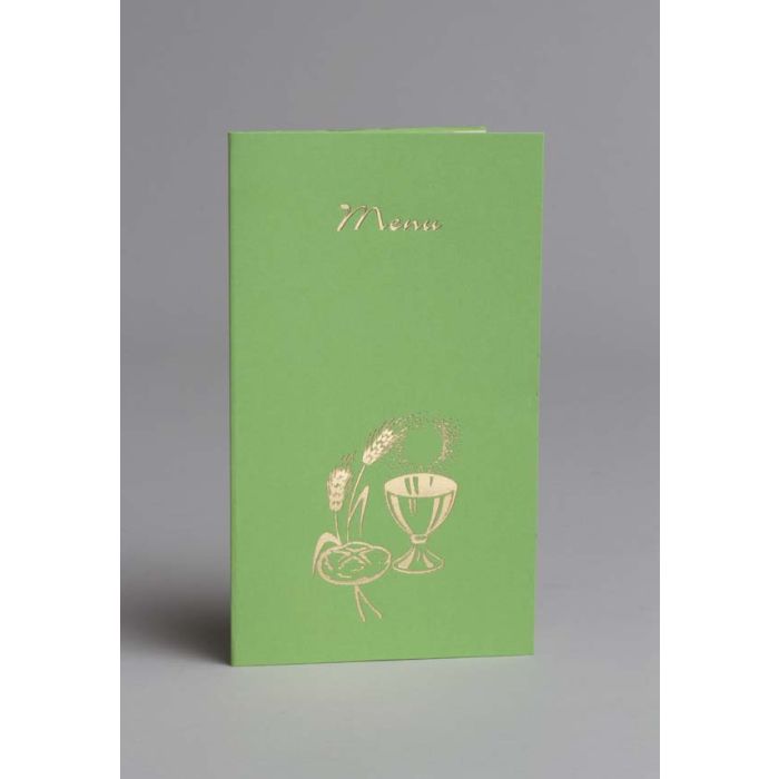 Lot de 10 menus de table Calice – Vert de la marque Yves DEININGER d’une hauteur de 17 cm et d’une largeur de 10 cm. Menus qui conviennent parfaitement pour une communion, un mariage ou un baptême.