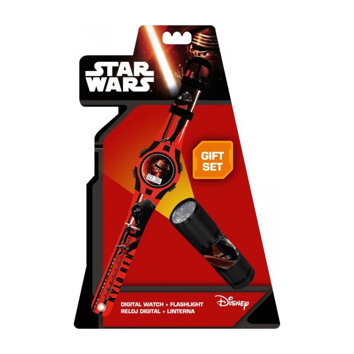 Afin que l'univers de Star Wars accompagne votre garçon au quotidien, nous vous proposons cette montre digitale + lampe Star Wars. Il s'agit d'une montre rouge et noire à l'effigie de Kylo Ren, un personnage central de Star Wars VII. Le cadran de la montre est digital, ce qui facilite la lecture de l'heure et l'on retrouve le masque de Kylo Ren sur le cadran de la montre. La lampe est noire avec une bande tout autour sur laquelle sont représentés les Clone Trooper et des sabres lasers rouges. Un petit cordon noir accompagne la lampe afin de pouvoir la tenir facilement.