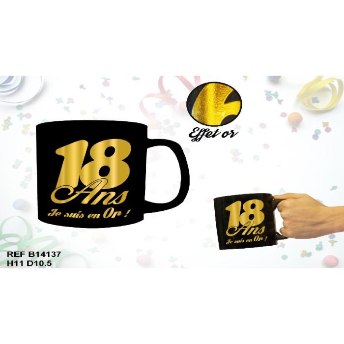 Mug or et noir des 18 ans mesurant 11 x 10,5 cm.