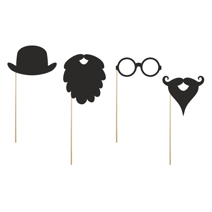 Kit photobooth gentleman, composé de 4 accessoires : barbe, moustache, chapeau, lunettes. De couleur noire, de 22 à 28 cm, en papier. Un must-have de photobooth !