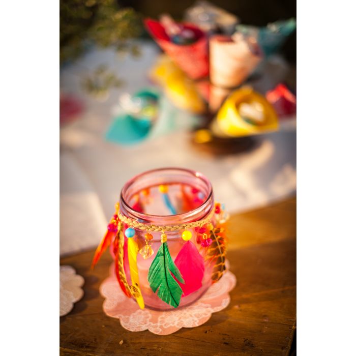 Si vous voulez apporter une touche chaleureuse à l'ambiance de votre fête, c'est l'accessoire qu'il vous faut : le photophore. Si vous avez choisi un thème mariage gipsy, ce photophore est fait pour vous. Couleur corail, il se mariera très bien avec des couleurs jaunes ou fuchsia. Décoré de perles et de plumes, ce photophore sera la petite touche originale de votre décoration de table. Il peut aussi très bien aller pour un anniversaire sur le thème gipsy.