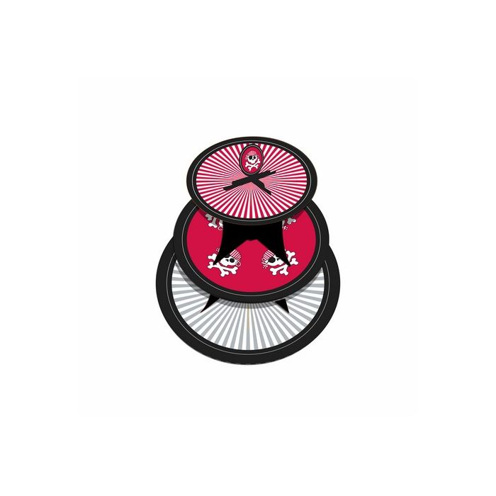 Voici un superbe présentoir à cupcakes 3 étages pirate ! De 30 x 33 cm, fabriqué en carton, et de couleur rouge et noire, ce présentoir fera son petit effet !