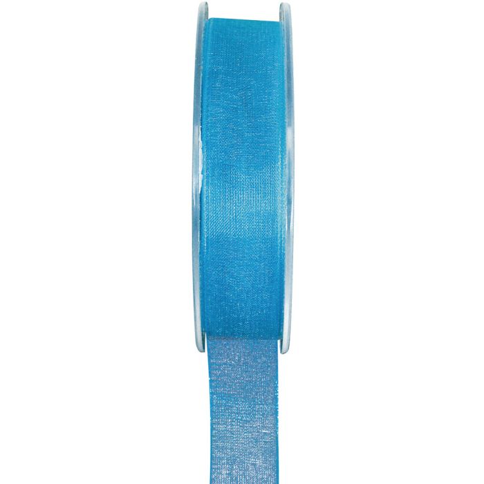 Ruban en organdi de couleur turquoise pour envelopper vos cadeaux ou personnaliser vos décorations. Bobine de 20 m de long et d'une largeur de 7 mm.