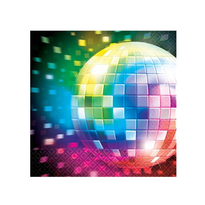 Lot de 16 serviettes en papier décorées sur le thème du Disco avec motif boule à facettes, de dimensions 33 x 33 cm.