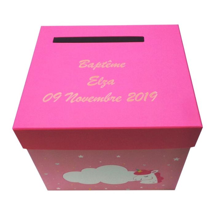 Faites l’achat de cette superbe urne rose fuchsia qui saura recueillir tous les cadeaux avec classe et tendresse. Cette urne décorée de licornes et de nuages sur un fond rose sait dire la fête et la joie. Ainsi, vous n’aurez aucun mal à l’assortir au reste de votre décoration sur le thème des licornes disponible sur notre site. Personnalisable, vous pouvez en profiter pour commander une urne authentique et unique qui saura servir de souvenir à votre enfant qui ne se souviendra probablement pas de son baptême et encore moins de sa baby shower. Quand un bébé arrive au monde ou qu’un projet se concrétise, offrir une contribution est toujours de mise lors d’un passage à un autre, lors d’une transition ou d’une nouvelle arrivée. Vous pourrez alors dire deux fois merci à vos invités : la première fois, la boite le dira pour vous et la deuxième fois, ce sera vous, en personne !